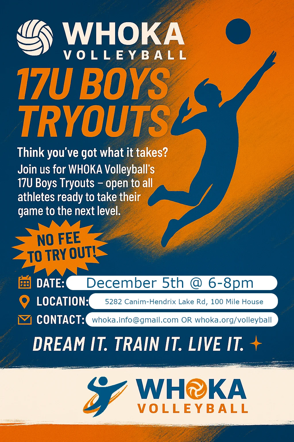 WHOKA Volleyball is excited to announce tryouts for our 2025 17U Boys Club Team!